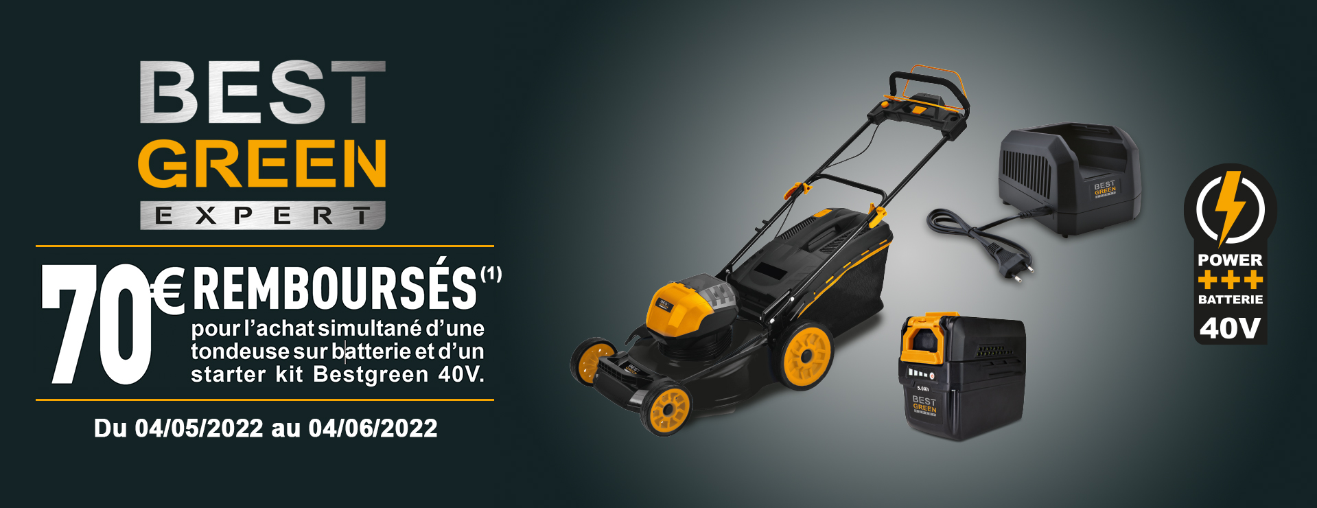 70€ REMBOURSÉS pour l’achat simultané d’une tondeuse sur batterie et d’un starter kit Bestgreen 40V.